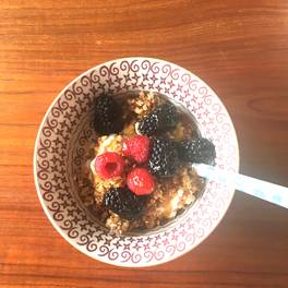 Un goûter hyper sain et de saison, avec des fruits frais, un coulis de framboise maison sur lit de fromage blanc crémeux