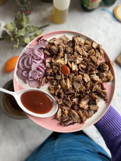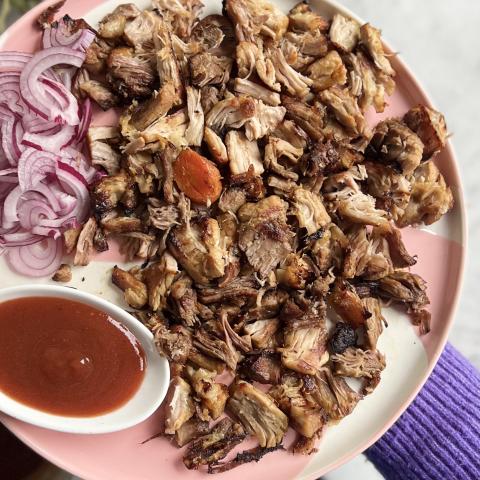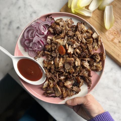 Effilocher la viande et l'étaler dans un plat de service. Disposer des oignons rouges et la sauce à côté. J'aime bien proposer les carottes qui ont servi à la cuisson dans un petit bol à côté, façon écrasé de carottes. Elles sont fondantes, c'est formidable !