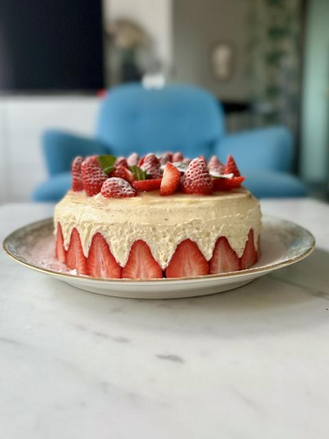Décorer avec les fraises restantes et remettre au frais jusqu'à dégustation. Le mieux est de laisser le gâteau au frais toute la nuit !