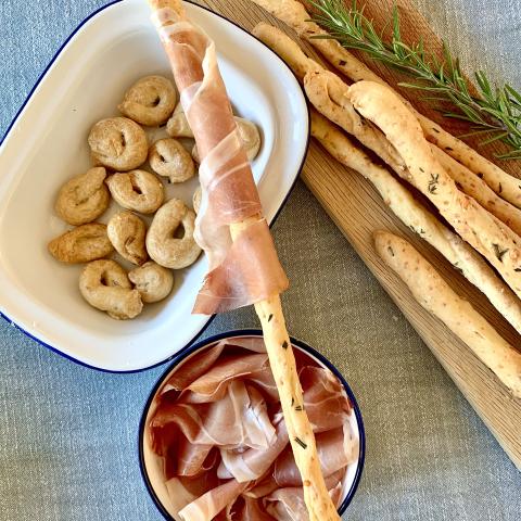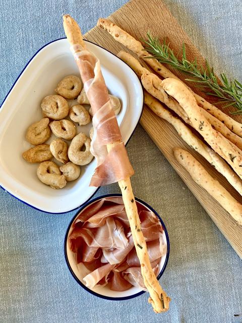 Débarrasser et laisser refroidir les gressins sur une grille. Ajouter fleur de sel et poivre concassé et déguster les gressins enrobés de San Daniele !