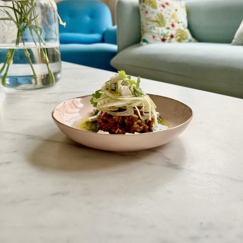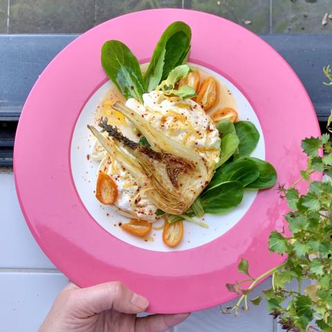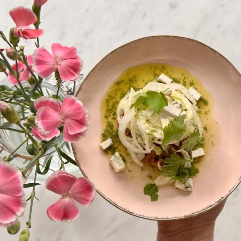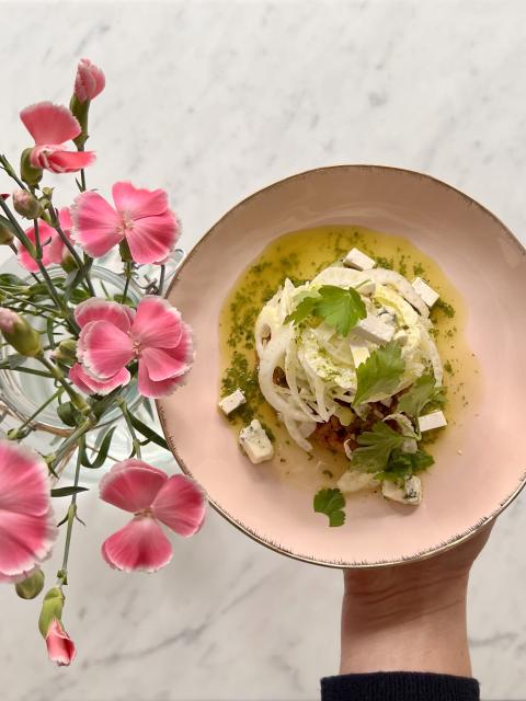 Quand l'épeautre est cuit, ajouter des dés de fromage à pâte persillée, ou parmesan. Cela va faire une liaison. Eventuellement, remettre un peu de bouillon pour garder un côté crémeux. Assaisonner de sel et poivre du moulin. Dans une assiette, déposer le petit épeautre dans un cercle (ou dans une tasse et vous retournez la tasse au milieu de l'assiette). Ajouter par dessus le fenouil finement émincé, un peu de sauce verte, des herbes fraîches. Retirer le cercle et arroser de sauce tout autour. En amoureux, je vous invite à déguster ce petit plat avec un petit verre de vin blanc ?