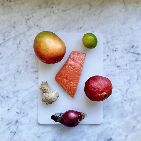 Ciseler l'oignon. Trancher finement le gingembre, puis tailler les tranches en fins morceaux. Prélever 1/4 de la mangue, l'éplucher, et couper des cubes de même taille que les dés de saumon.