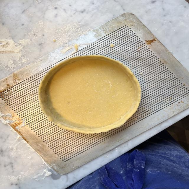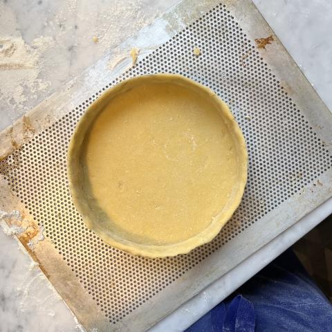 Astuce : abaisser la pâte entre 2 feuilles de papier sulfurisé ou dans une feuille guitare et la réfrigérer ensuite pour gagner du temps lors du montage de la tarte.
