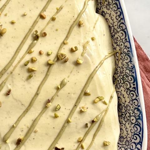 Un délice crémeux et ferme à la fois, au goût subtil de pistache. Au printemps, on peut même ajouter des fraises équeutées et coupées dans le sens de la longueur.